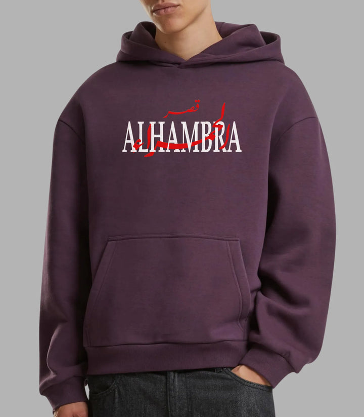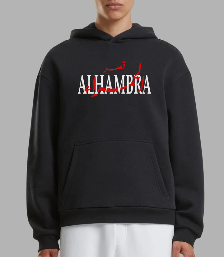 The Alhambra Heritage Hoodie honors one of history's most iconic monuments, the Alhambra Palace of Granada, Spain. The front features "ALHAMBRA" in strong white lettering, woven with bold red Arabic script for قصر الحمراء, blending two worlds of artistic heritage into a single visual statement.