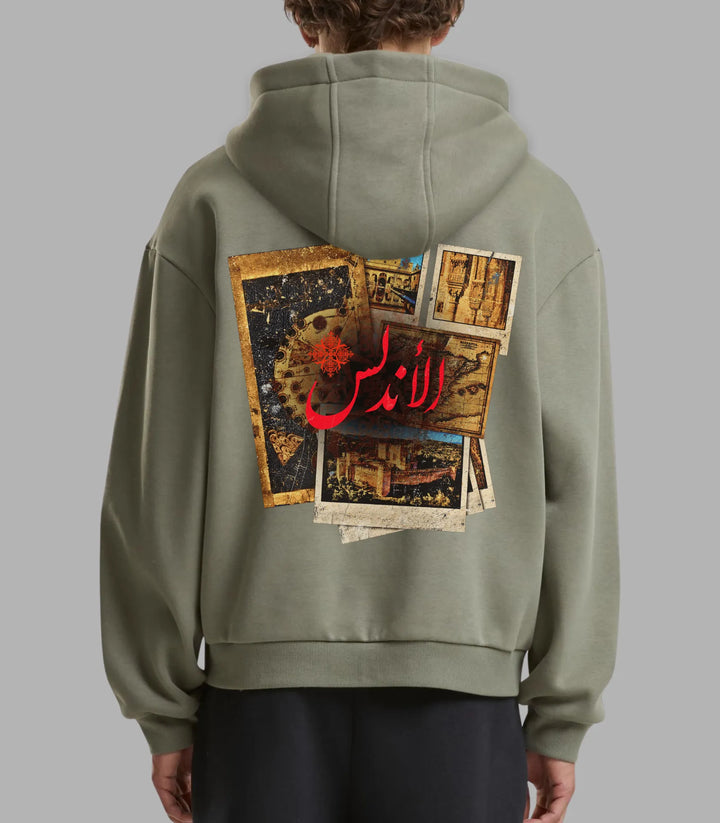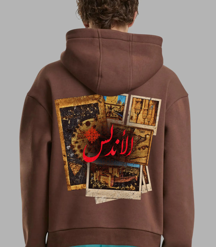 The back is a collage masterpiece, layering vintage postcards, maps, architectural motifs, and handwritten notes with the bold and meaningful script الأندلس (Al-Andalus) in red. This design evokes nostalgia and connection, inviting wearers to reflect on a legacy of tolerance and enlightenment. The interplay of rich, earthy tones with calligraphy and ornamentation celebrates a timeless story, making each hoodie a wearable tribute to a golden era of cross-cultural innovation.