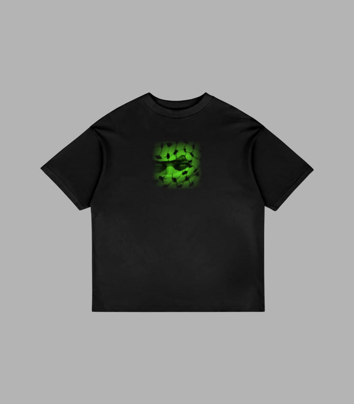 The Resistance Code T-Shirt is a wearable manifesto, a tribute to a struggle that has evolved from the streets to the digital realm. The front features the intense, watchful eye of a witness—a gaze that has seen history unfold and remains unbroken, peering through the fragmented pattern of a keffiyeh.