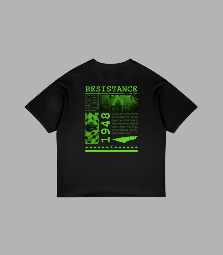 The back is a complex digital tapestry that serves as the t-shirt's core message. Dominated by the declaration "RESISTANCE IS THE CODE," the design fuses historical memory with modern advocacy. The year 1948 is displayed prominently, marking a pivotal moment of displacement and the beginning of a legacy of resilience. A collage of poetic text speaks of a "digital battlefield where a new song is born," set against a "Matrix"-style cityscape. This piece is a statement that the fight for justice now exists in the silence of shadows and the binary burn of code, with the map of historic Palestine at its heart.