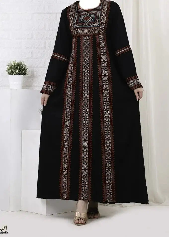 product overview : An elegant Palestinian embroidered abaya, featuring intricate traditional patterns, a classic round collar, and striking black and red colors that blend boldness with cultural heritage